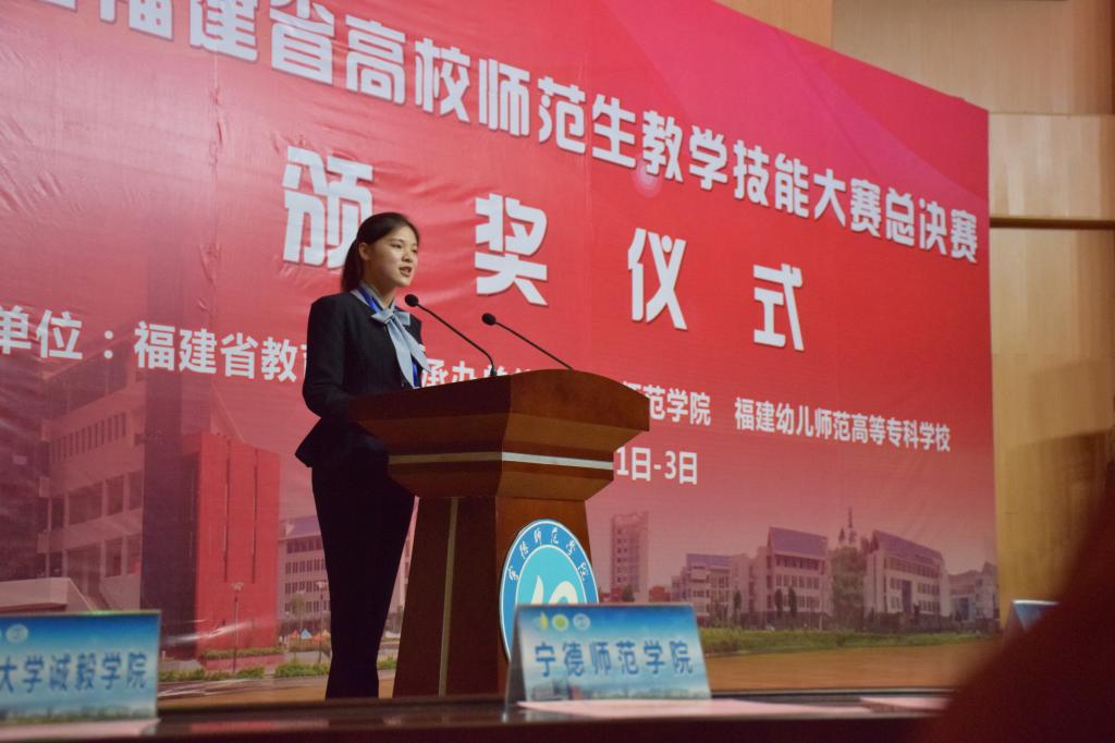 我校2014级化学专业汤远芳同学代表所有参赛和获奖选手上台发言,她感谢省教育厅和学校为高校师范生教学技能的培养提供了一个好的平台,学习与交流、体验与成长、付出与努力是她参赛的最大收获。