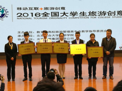 为推动移动信息技术与旅游产业的融合创新,加强旅游管理类专业学生创新创业能力的培养。教育部高校旅游管理类专业教学指导委员会发起以“移动互联+旅游创意”为主题的全国大学生旅游创意大赛。11月13日,大赛总决赛在北京联合大学旅游学院举行。我校作品“霍童·驿游APP”在总决赛中喜获三等奖。