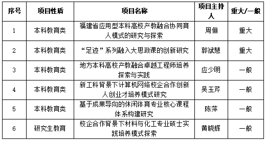 近日,福建省教育厅发布了《关于公布2024年本科高校教育教学研究项目立项名单的通知》(闽教高〔2024〕30号),我校6个项目获批立项。