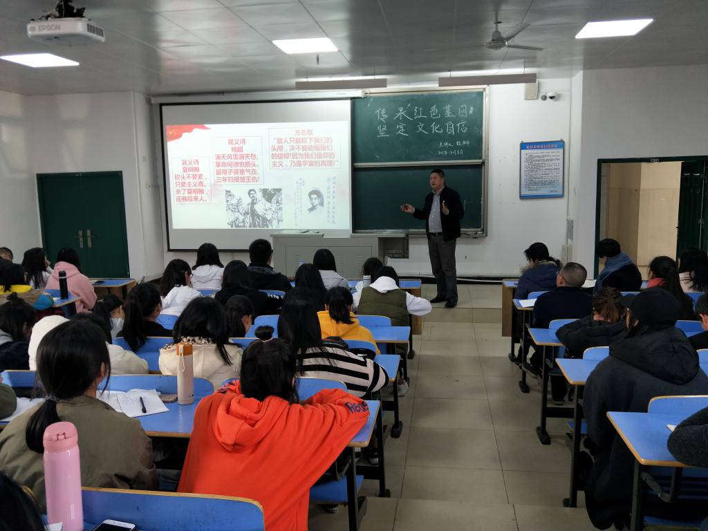 赖艳华副教授从革命文化内涵中向同学们讲到了建国前党的精神:红船精神、井冈山精神、苏区精神、长征精神、抗战精神、延安精神以及西柏坡精神。让同学们更加深了解党的坚定信念、艰苦奋斗、勇创新路的精神。他从文化自信方面向同学们提出期盼,要坚定道路自信、理论自信、制度自信,文化自信。他强调,文化自信是更基础、更广泛、更深刻的自信,文化自信是更基本、更深沉、更持久的力量。