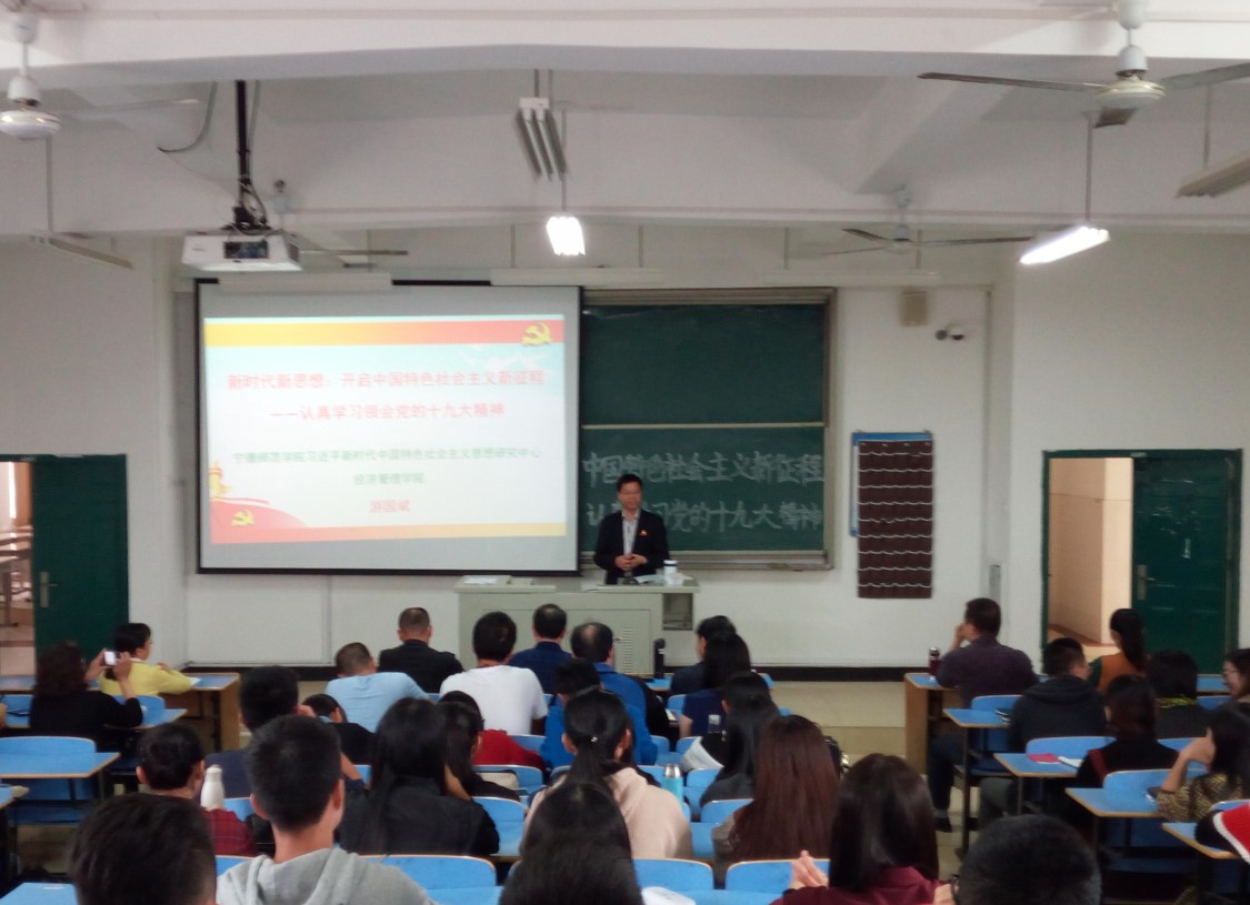 2017年11月8日下午,经济管理学院在求真楼A区301举办学习党的十九大精神宣讲报告会,花椒直播习近平新时代中国特色社会主义思想研究中心副主任、经济管理学院院长游国斌教授以“新时代新思想:开启中国特色社会主义新征程——认真学习领会党的十九大精神”为题作了宣讲报告。