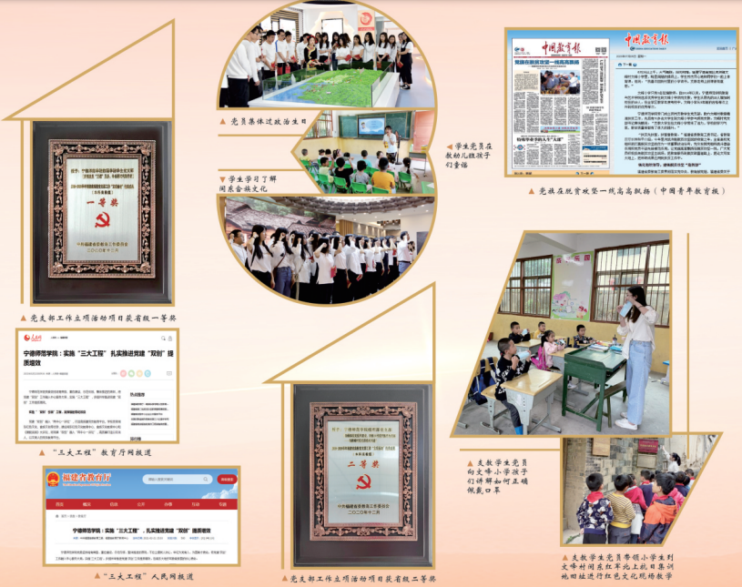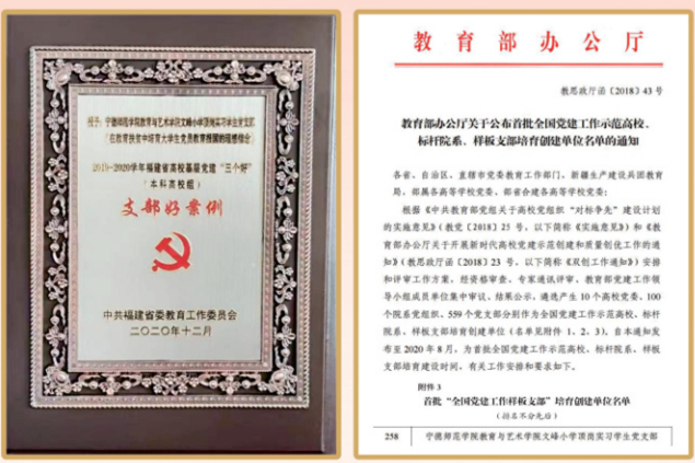 全国党建工作样板支部教育与艺术学院文峰小学顶岗实习学生党支部通过顶岗支教形式,将党支部建在贫困村上,走出了一条抓党建促乡村教育扶贫的新路子。文峰小学顶岗实习学生党支部党建案例入选“福建省新时代党建品牌、优秀案例”,党支部工作立项活动项目获省级一、二等奖。
