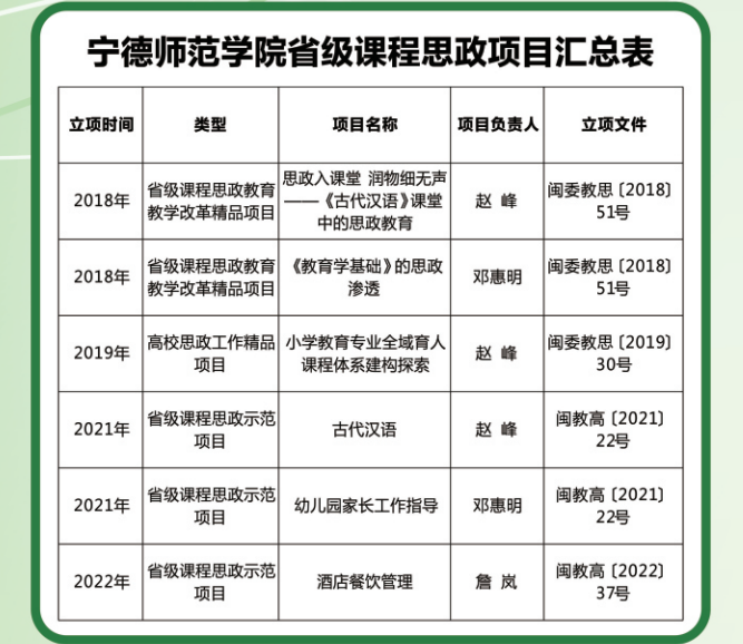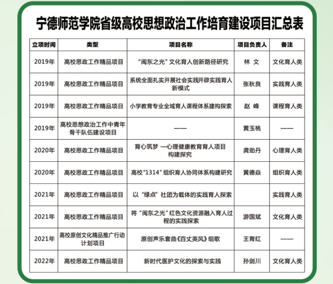 践行习近平总书记在花椒直播工作期间提出的“把闽东之光传播开去”的殷切期望,建设“闽东之光”校园文化工程,成立闽东之光研究院。建成闽东之光教育基地,每年组织师生参观学习,面向社会开放接待,累计接待人数4万余人次。传承保护闽东畲族文化,开设全国首个畲族歌言传唱班,编辑出版《凤凰锵锵杜鹃红》等畲族红色文化书籍,成立全省首个畲族舞蹈班,原创畲族舞蹈《藤牌魂》、《畲带情》等在福建省大学生艺术节上多次获奖,“畲族歌舞”入选福建省高校中华优秀传统文化传承基地。《挖掘传承畲族文化》获全国校园文化优秀成果奖。连续举办十一届红色经典诗文诵读大赛,创作声乐套曲《百丈英风》组歌,歌颂闽东革命先辈,传承红色基因。开展地方志研究,整理完成《四库全书闽东卷》共计12册300多万字。将闽东各县市特色文化元素融入校园文化建设,校园内建设“弱鸟先飞”、“滴水穿石”小品雕塑,蓝田书院、非物质文化遗产“福船”等项目,成为传播“闽东之光”的重要载体。