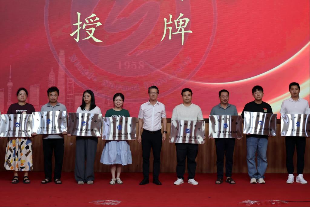 出征仪式中江潮炳为各二级学院授社会实践基地牌,并与相关单位负责人为实践队代表授旗。