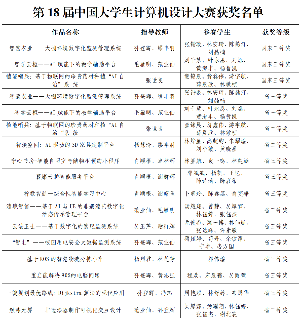近日,第18届中国大学生计算机设计大赛国赛圆满落幕,我校信息工程学院学子凭借扎实的专业功底与出色的创新能力斩获“软件应用与开发”赛道全国三等奖2项、“物联网应用”赛道全国三等奖1项。
