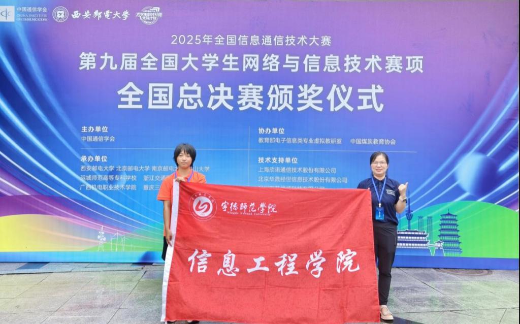 近日,2025全国信息通信技术大赛暨第九届全国大学生网络与信息技术大赛总决赛在西安邮电大学圆满落幕。我校信息工程学院吕思宁同学在冯玮老师的精心指导下,以省赛第一名的优异成绩成功晋级全国总决赛,并在8月22日的决赛中凭借扎实的专业功底与出色的实践能力脱颖而出,斩获“5G 网络工程实践赛道”本科组全国一等奖。这是我校学子第二次在该赛事摘得全国一等奖,再次彰显了我校在信息通信领域人才培养的功底与实力。