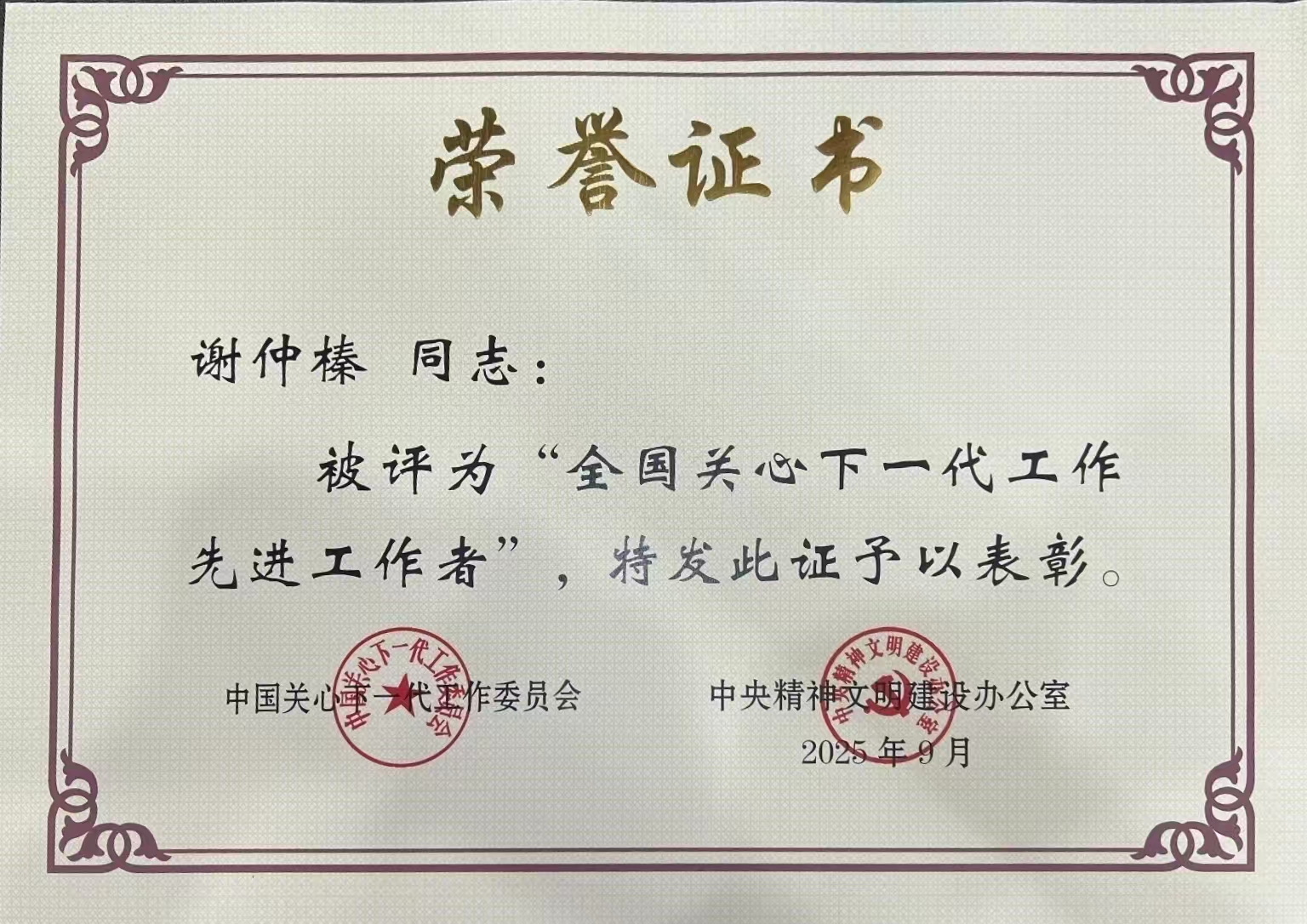 近日,纪念中国关心下一代工作委员会成立35周年暨全国关心下一代工作表彰大会在北京召开。我校关工委常务副主任谢仲榛被授予“全国关心下一代工作先进工作者”称号。