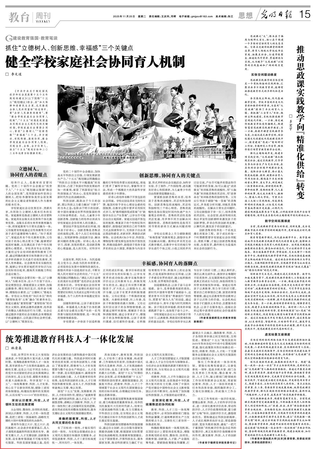 2025年11月25日出版的《光明日报》刊发我校党委书记林清泉署名文章《统筹推进教育科技人才一体化发展》。全文如下: