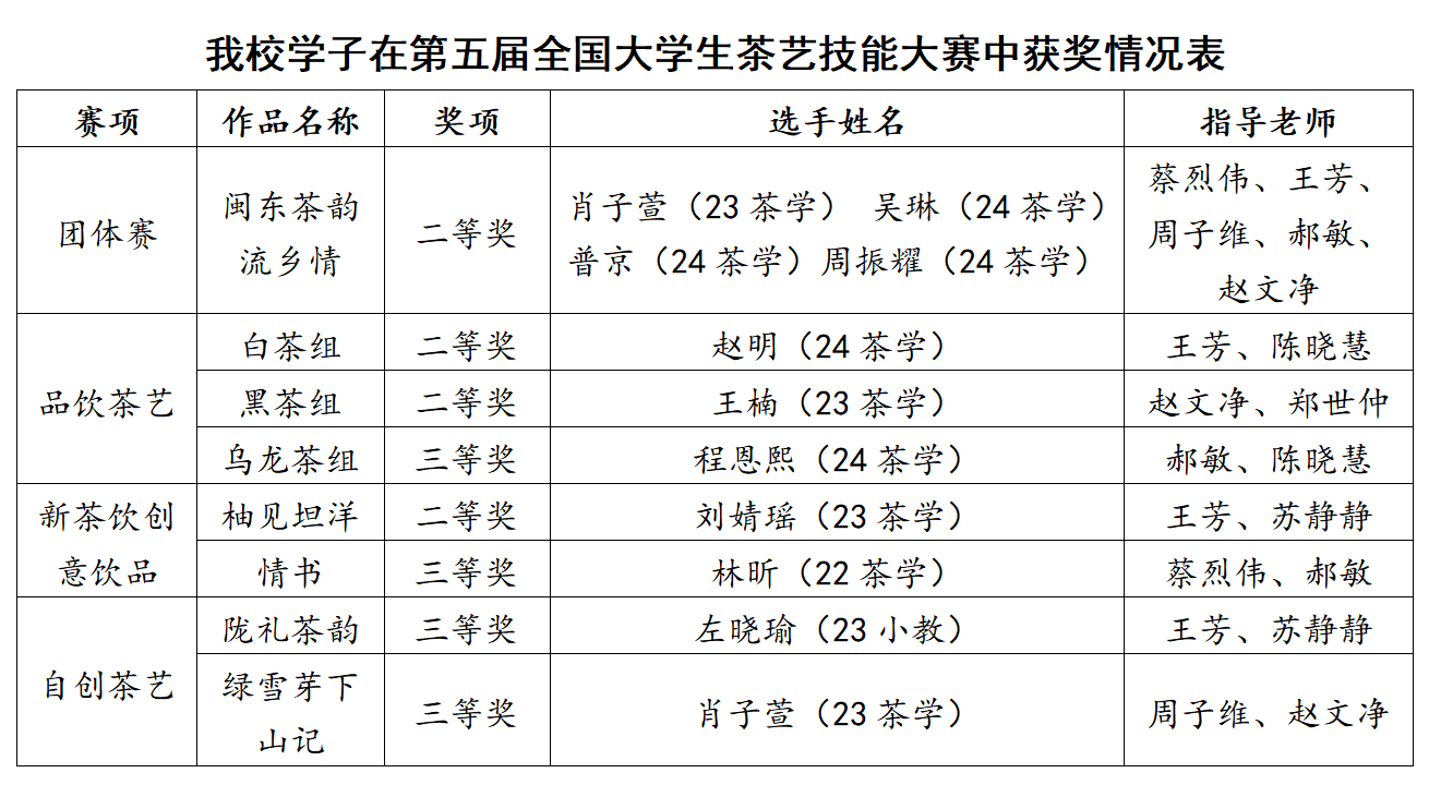 12月10日-12日,由高等学校国家级实验教学示范中心联席会主办,云南农业大学等单位联合承办的“中茶杯”2025年第五届全国大学生茶艺技能大赛全国总决赛在昆明拉开帷幕。我校茶学系在指导老师的精心指导下,团结协作,勇于创新,凭借扎实的专业功底与出色的临场发挥,荣获大赛二等奖4项,三等奖4项,展现了学校在茶学教育与应用型人才培养方面的显著成效。