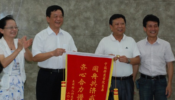 最后,陈雅芳校长对我校的热情接待和经验传授表示衷心的感谢,万建民书记、陈雅芳校长代表泉州幼儿师范高等专科学校向我校赠送纪念品及一枚印着“同舟共济求发展,齐心协力谱新篇”的锦旗。