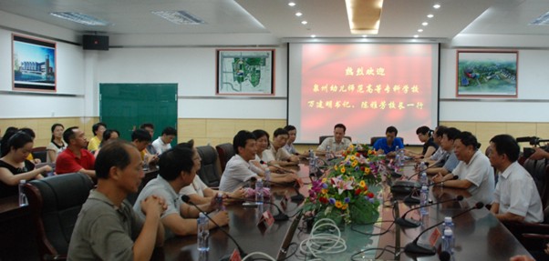 7月3日下午,泉州幼儿师范高等专科学校党委万建民书记、陈雅芳校长一行四十余人来我校考察交流。座谈会在会议室308召开,校党委书记江小源,校长林跃鑫,校党委副书记林朝忠,副校长谢向东,校党政办、教务处、学工处、团委、保卫处等有关单位负责同志参加了座谈会。座谈会由江小源书记主持。