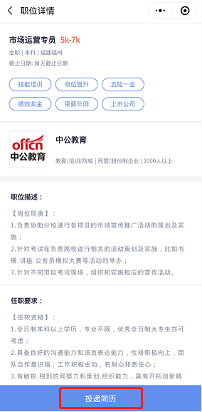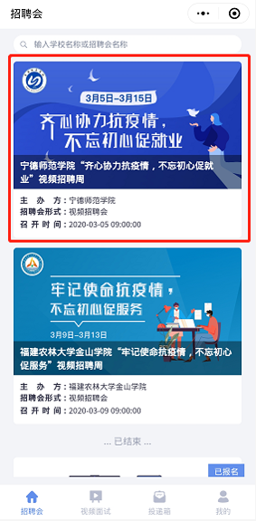 点击页面下方菜单栏招聘会,选择“花椒直播2020年春季毕业生‘齐心协力抗疫情,不忘初心促就业’视频招聘周”,进入查看企业职位列表,点击“报名招聘会”,选择相关职位后进行投递简历。