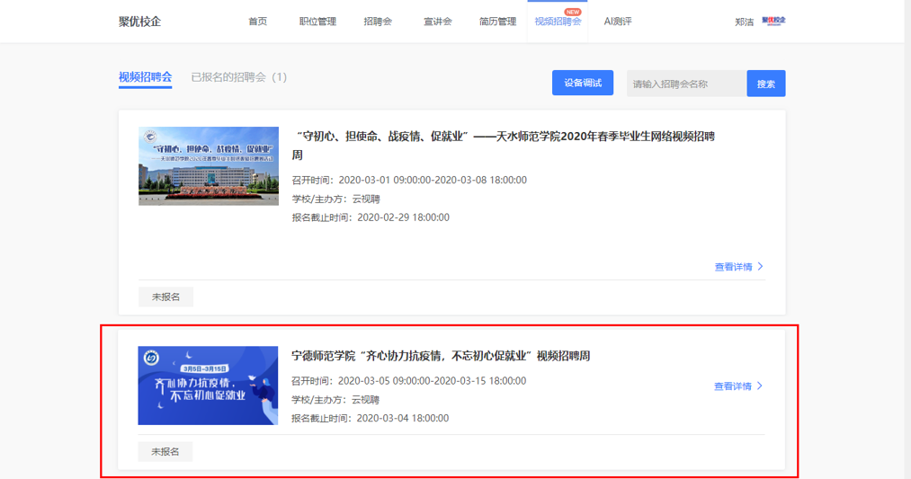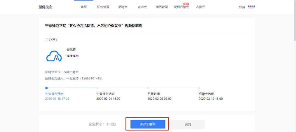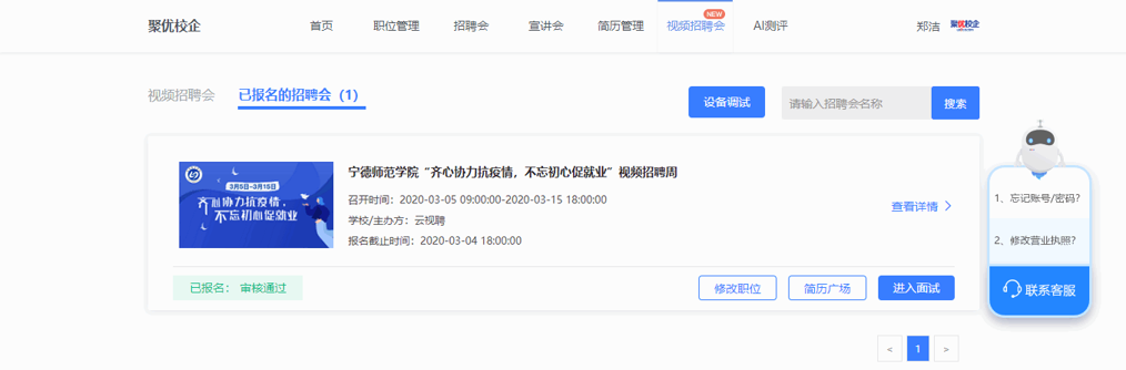 待入驻状态变为审核通过状态后点击页面上方导航栏“视频招聘会”,选择“花椒直播2020年春季毕业生‘齐心协力抗疫情,不忘初心促就业’视频招聘周”,点击查看详情,点击报名招聘会后填写相关信息后即可报名成功,待审核成功后即可参与招聘会。