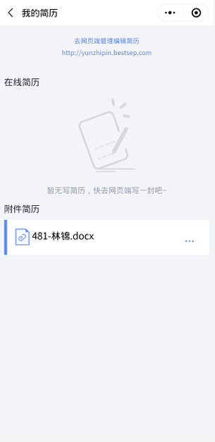 进入页面后点击下方菜单栏“我的”,点击“我的简历”,进行上传简历或登录网页端http://yunzhipin.bestsep.com制作一份简历。