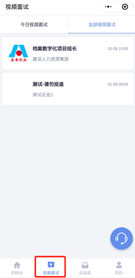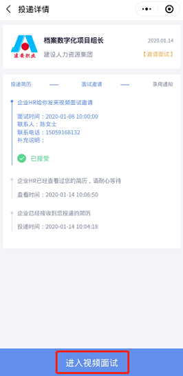 投递简历成功后,企业邀约面试,注意留意短信、小程序、邮件通知,在约定时间内进入页面点击“视频面试”,选择岗位后点击“进入视频面试”即可。