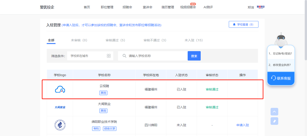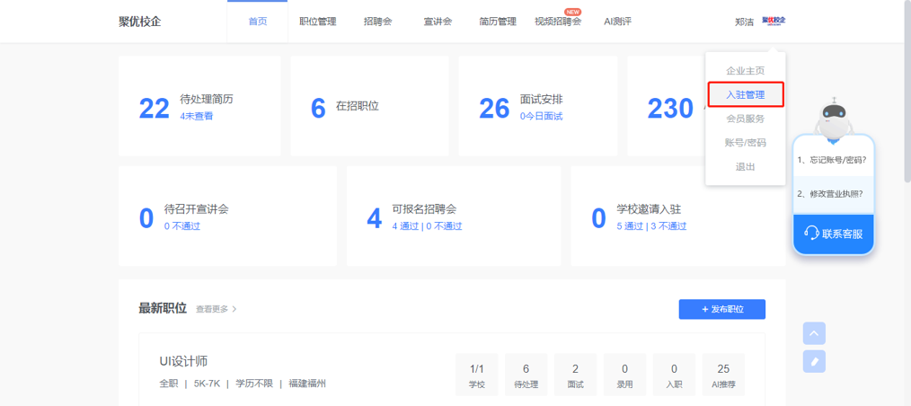 登录后点击右上方头像,选择入驻管理,申请入驻“云视聘”,待审核通过后进入下一步。