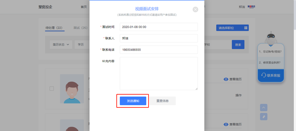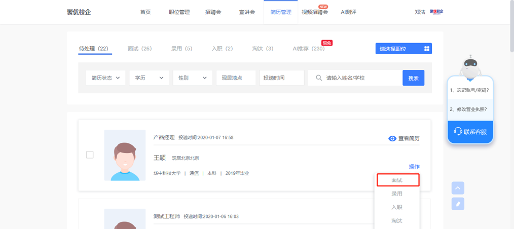 招聘会报名成功后,点击页面上方导航栏“简历管理”,对相关投递简历学生进行面试邀请,点击“操作→面试”,填写面试安排发送通知即可。