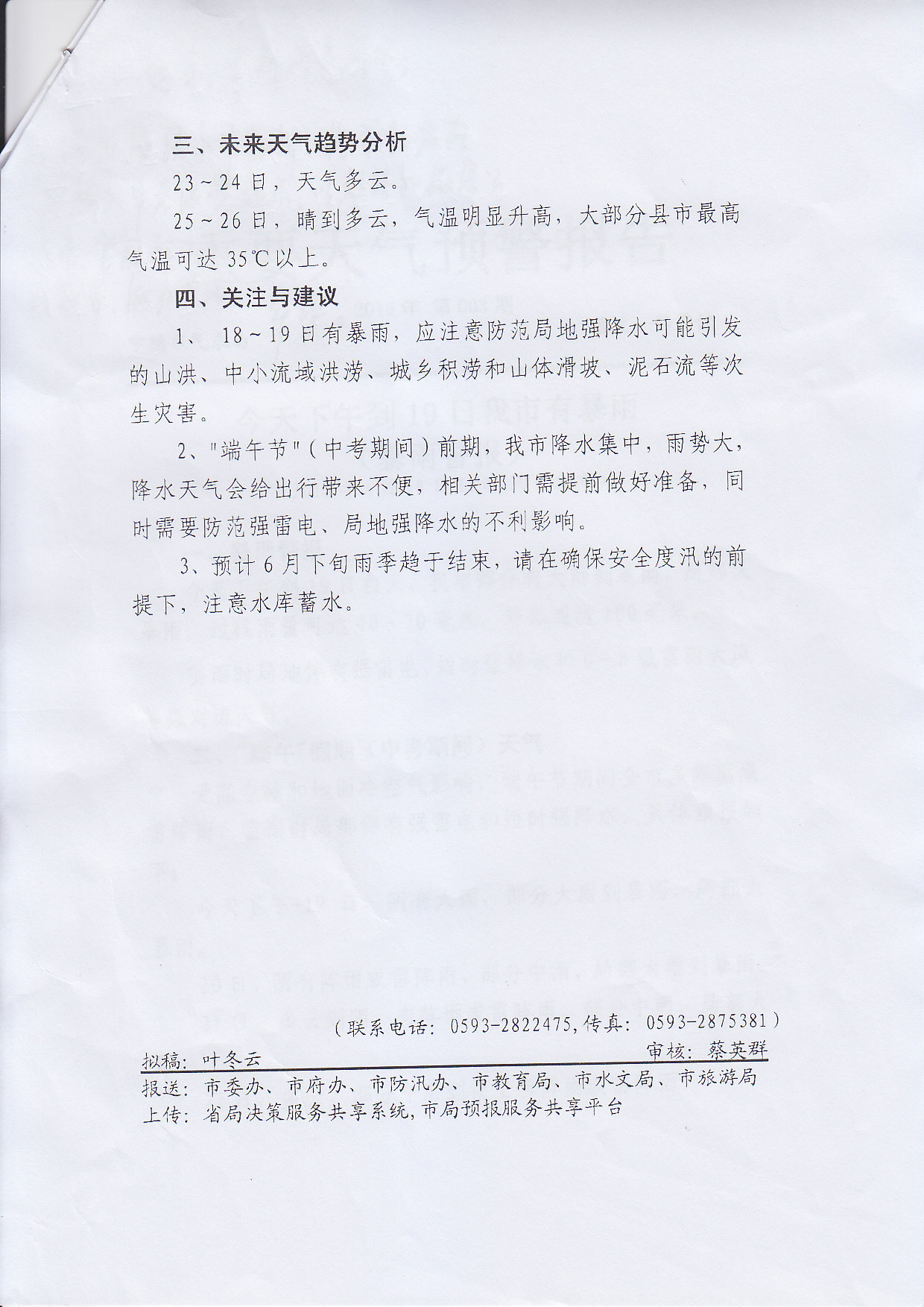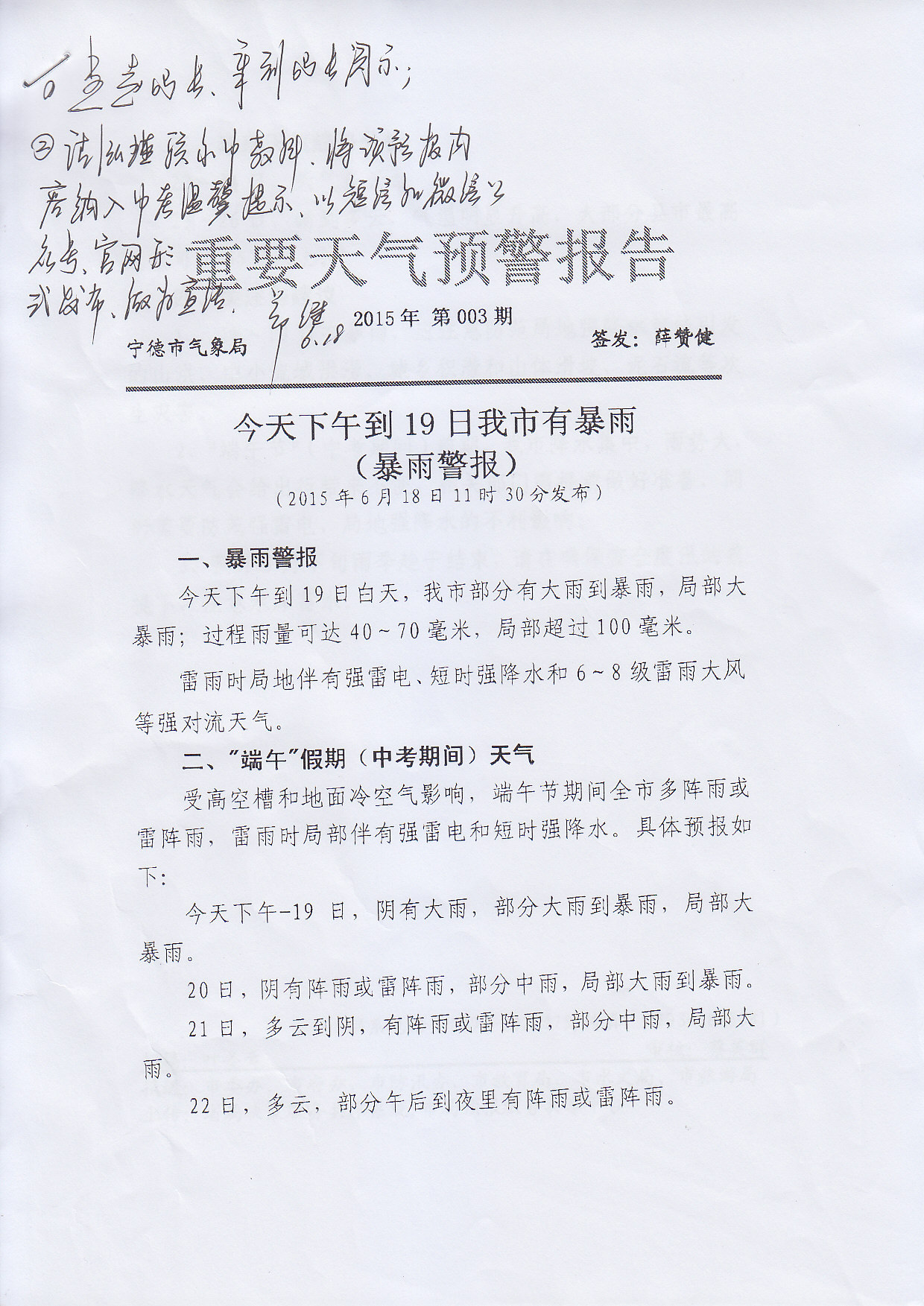 根据气象部门预报,我市今天下午到19日有暴雨。现将花椒直播市气象局《重要天气预警报告》(2015年第003期)转发给你们,请结合实际,积极采取应对措施,并通知本单位师生做好相关防范工作。