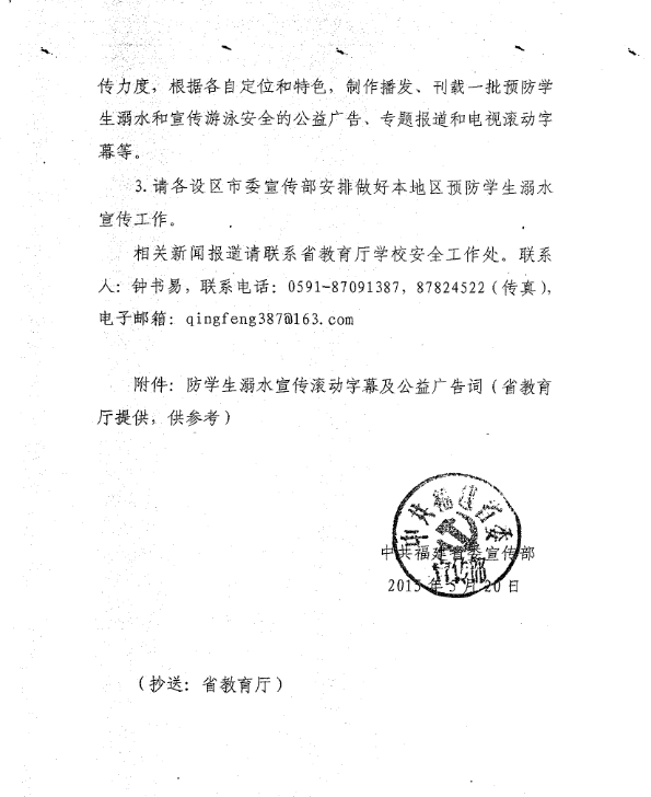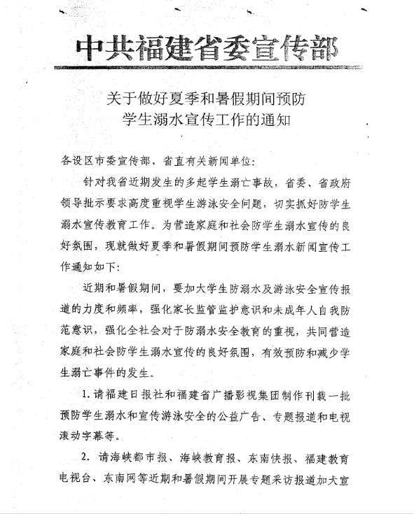 附件:中共福建省委宣传部《关于做好夏季和暑期预防学生溺水宣传工作的通知》