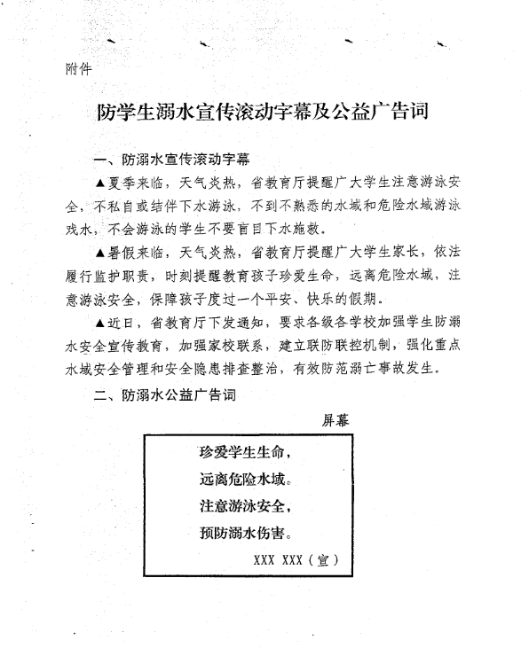 根据《中共福建省委宣传部关于做好夏季和暑期预防学生溺水宣传工作的通知》要求,请各系和有关单位高度重视学生游泳安全问题,切实抓好近期和暑假期间防学生溺水宣传教育工作,有效预防和减少学生溺亡事件的发生。