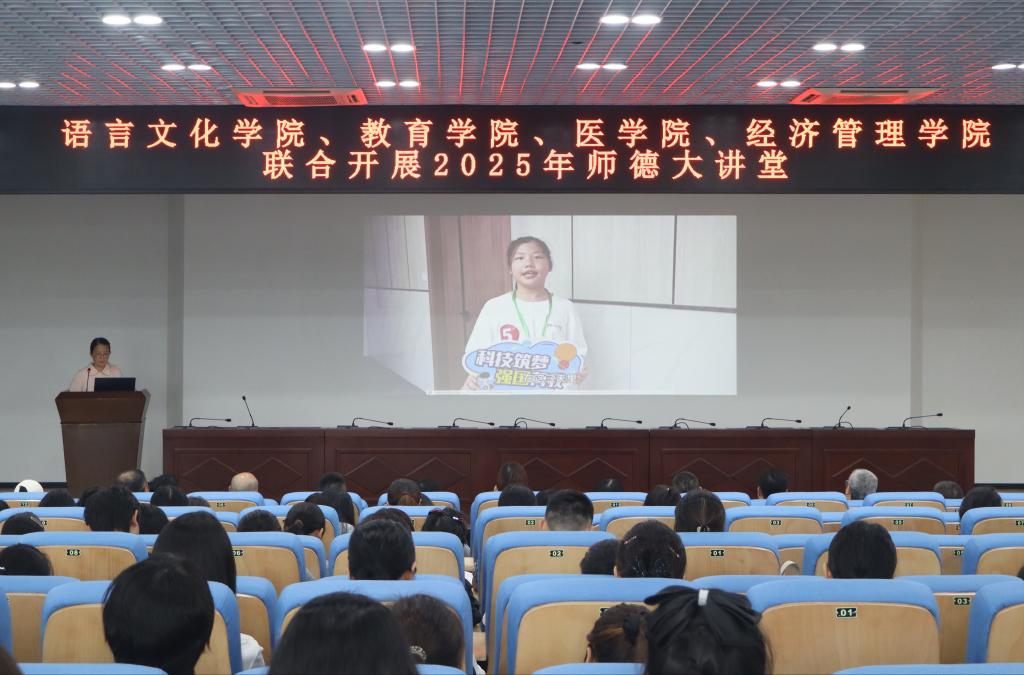 为进一步学习贯彻落实习近平总书记关于教育的重要论述和全国、全省教育大会精神,大力弘扬教育家精神,推进师德师风建设,9月23日下午语言文化学院、教育学院、医学院、经济管理学院联合举办师德大讲堂,邀请语言文化学院教师周珍霓担任主讲嘉宾,围绕“以爱为桥,点亮星河:论新时代青年教师的师德修为”主题展开深度分享,会议由语言文化学院党委书记吴立志主持,教职工近290人现场参会。