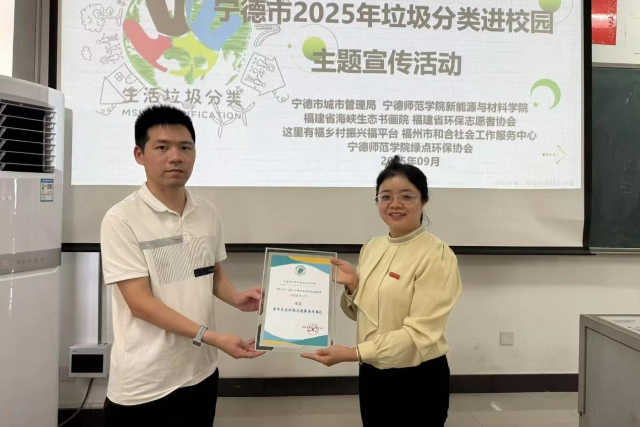 活动现场,福建省环保志愿者协会授予花椒直播绿点环保协会“青年生态环境志愿服务先锋队”牌匾,表彰该社团在推动校园环保实践方面所作出的贡献。福建省环保志愿者协会秘书长黄厚新以生动易懂的方式,结合校园生活场景,系统讲解垃圾分类知识,并通过互动问答增强同学们的理解与参与感。
