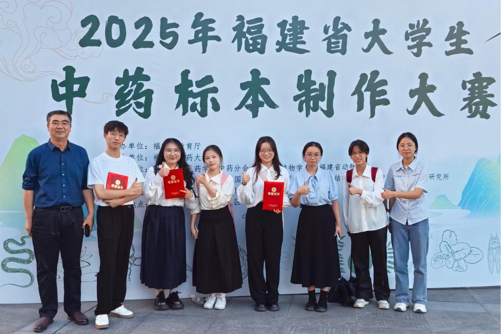 近日,由福建省教育厅主办、福建中医药大学承办的2025年福建省大学生中药标本制作大赛决赛在福建中医药大学旗山校区圆满落幕。我校生物科学与工程学院参赛团队在阮少江、刘凯良两位老师的悉心指导下,凭借扎实的专业知识和创新精神,在激烈的竞争中脱颖而出,共斩获三项省级三等奖。其中,叶安琪、曾培娜、郭名杰、黄欣悦同学制作的标本作品《柳叶蜡梅》,林胜凯、余雅婷、陈梓炫、黄格格同学制作的标本作品《合欢》获药用植物标本组三等奖;陈梓炫、余雅婷、黄格格、林胜凯同学创作的创新作品《万物生》,获创新创意标本组三等奖。