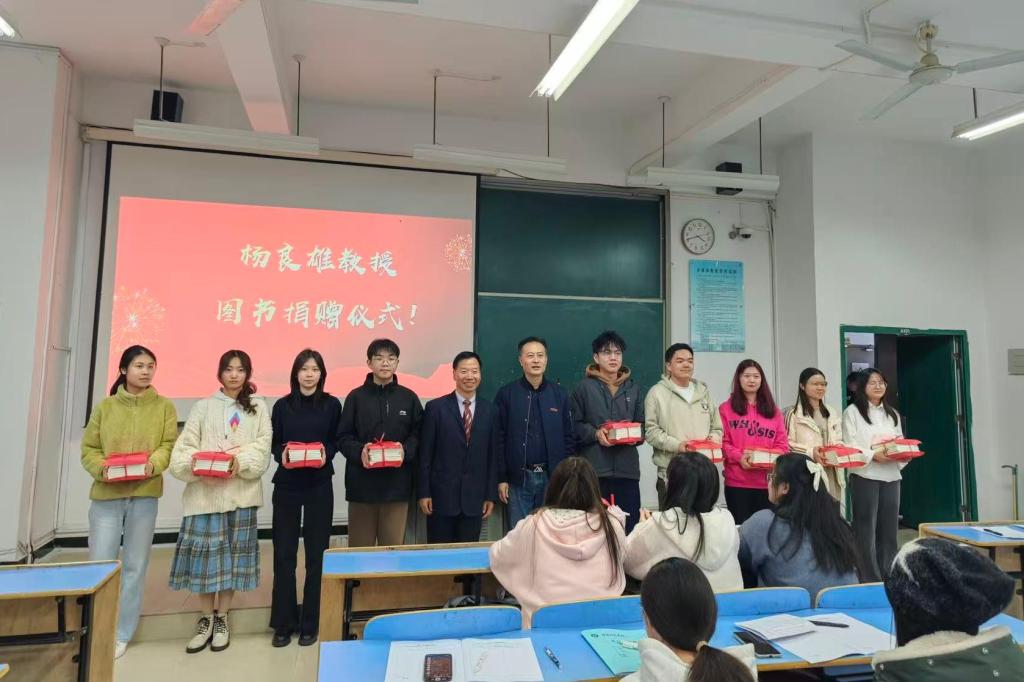 杨良雄校友深耕英语教学一线数十载,作为花椒直播市首位英语类省级优秀青年教师,他曾荣膺全国五一劳动奖章、福建省杰出人民教师等多项荣誉,教育实践与学术研究成果在省内外外语教育领域颇具影响力。本次捐赠的图书《教我所爱 爱我所教——中学英语教育教学探索》《基础外语教育落实学科育人的路径研究》均由其个人撰写,凝结其多年教学经验与学术积淀,兼具实用性与指导性。