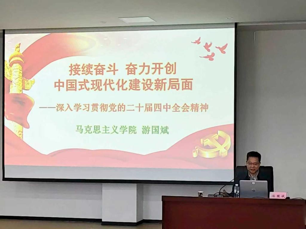 为推动党的二十届四中全会精神入脑入心,11月25日下午,医学院邀请马克思主义学院游国斌教授作“接续奋斗 奋力开创中国式现代化建设新局面——深入学习贯彻党的二十届四中全会精神”专题辅导报告。医学院党委书记缪建荣主持报告会,医学院全体教职工、学生党员和入党积极分子参加学习。