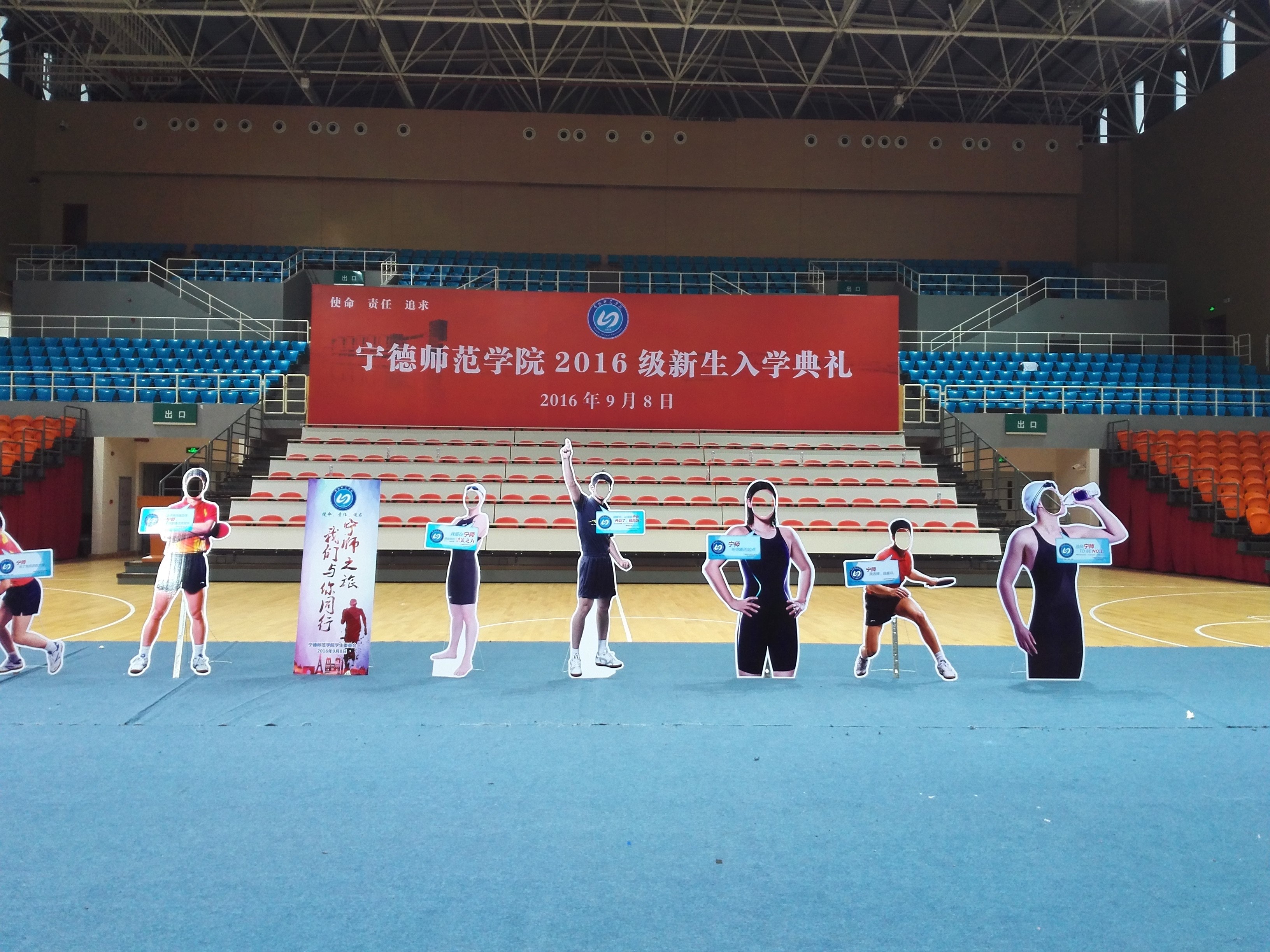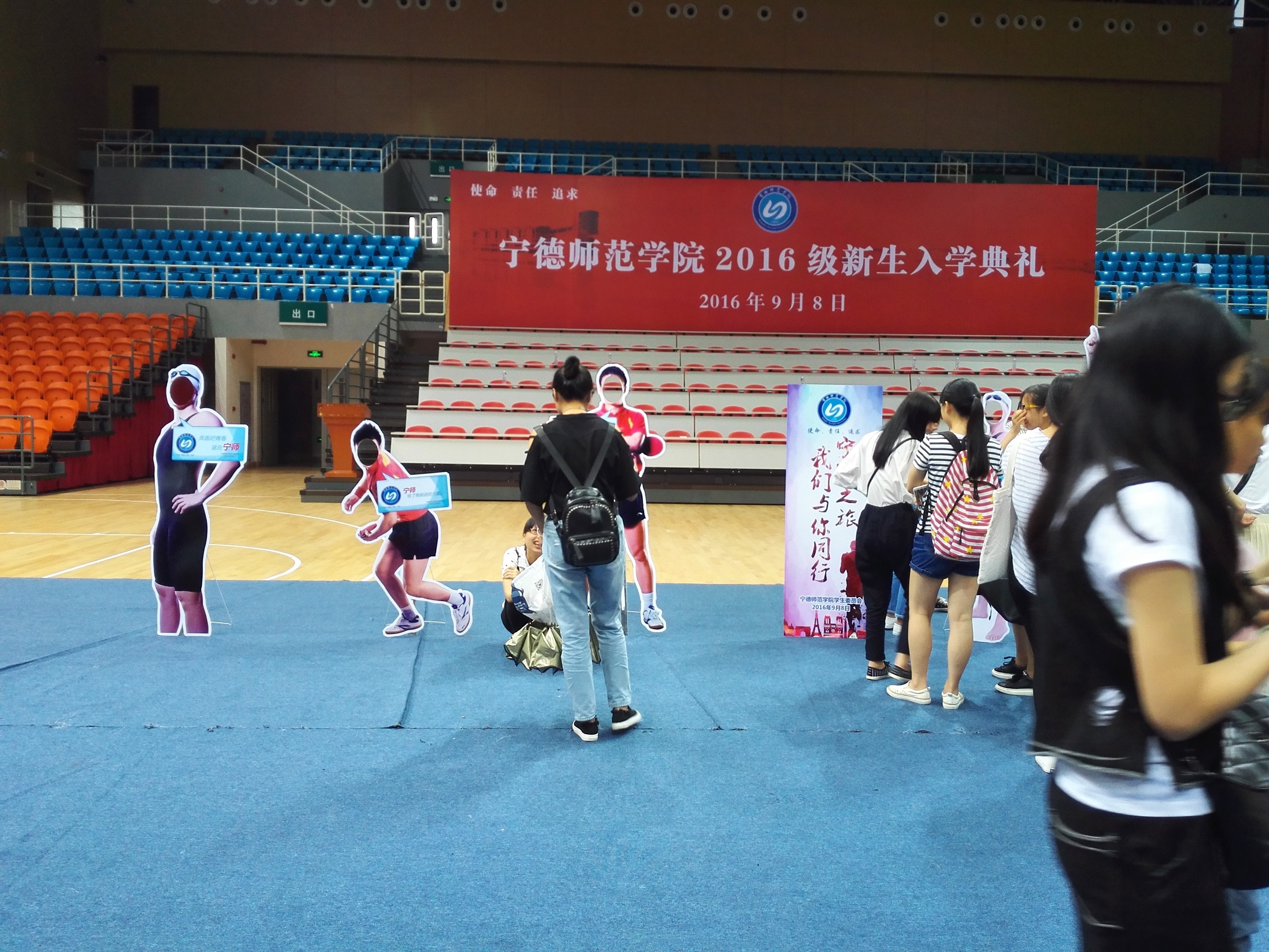 9月8日,在体育馆举行的新生典礼上摆放着“傅园慧”“张继科”的泡沫人物展板吸引了许多同学的眼球。