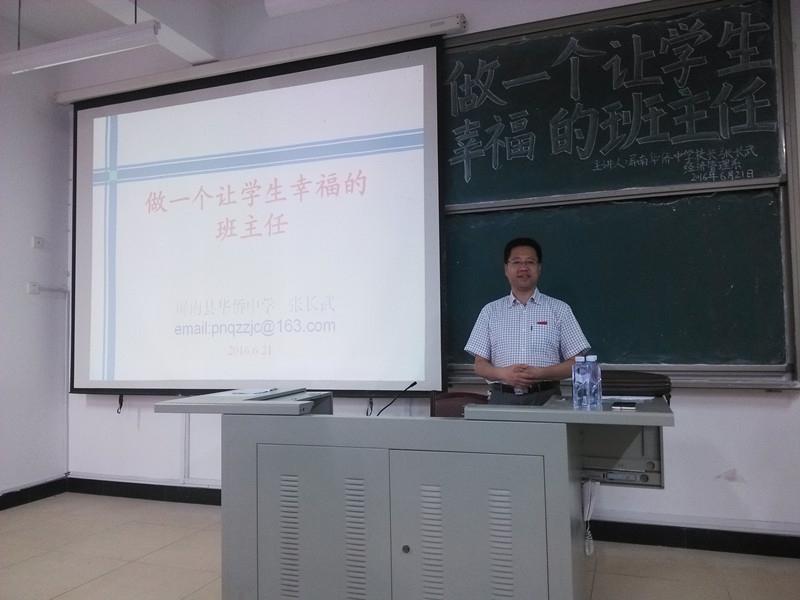 6月21日下午,经济管理系在求真楼b-201开展了“做一个让学生幸福的班主任”专题讲座。本次讲座由屏南华侨中学校长张长武主讲。系主任兼系党总支书记游国斌、系党总支副书记周建辉、系思政教研室主任林心雨以及13级思想政治班全体同学参加了本次讲座。系主任兼系党总支书记游国斌主持本场讲座。