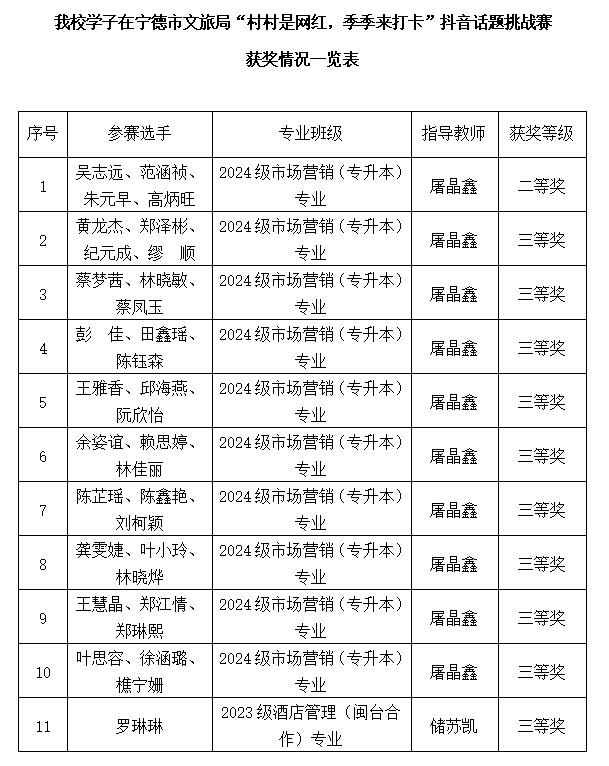 此次获奖不仅是同学们创作能力与创新精神的体现,也彰显了我校在培养学生创新思维、实践能力与新媒体素养方面取得的显著成效。学校将坚持将创新创业教育融入人才培养全过程,鼓励学生积极参与各类创新创业实践活动,以赛促学、以赛促创,为地方文旅产业发展贡献力量。