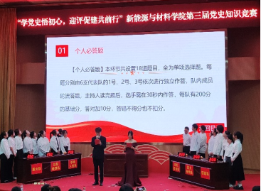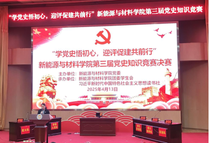 为深入推进党史学习教育,助力我校本科教育教学审核评估工作,营造“人人关心评估、人人了解评估、人人参与评估”浓厚氛围,4月13日晚,新能源与材料学院精心策划的“学党史悟初心,迎评促建共前行”第三届党史知识竞赛决赛在校图书馆报告厅成功举办。此次竞赛创新地将党史知识与迎接本科教育教学审核评估的相关内容相结合,吸引了众多师生踊跃参与。