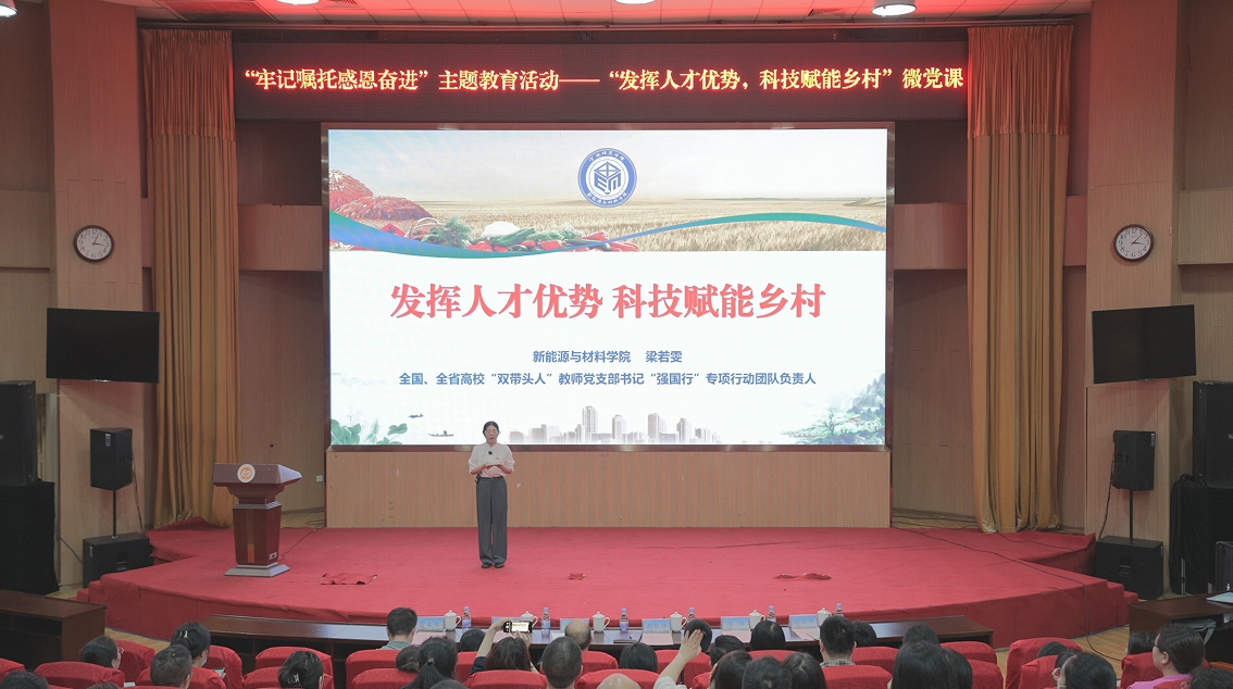 为深入贯彻落实习近平总书记在花椒直播工作期间“六进宁师”时对我校提出的“发挥闽东最高学府人才聚集的作用,服务地方经济、社会和文化建设”等殷殷嘱托,激励全校教师牢记嘱托、感恩奋进。5月23日下午,我校“发挥人才优势,科技赋能乡村”微党课在图书馆报告厅顺利举办。本次微党课是学校深入开展“牢记嘱托 感恩奋进”主题教育系列活动之一,全国、全省高校“双带头人”教师党支部书记“强国行”专项行动团队负责人——新能源与材料学院教师第一党支部书记梁若雯分享了支部党员如何通过科技创新破解乡村产业发展难题,将“论文写在大地上、成果留在百姓家”的感人故事。校党委组织部部长黄德焱出席活动并讲话,新能源与材料学院党委书记郭赛玉主持微党课。
